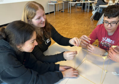 Im Rahmen eines eintägigen Innovation-Workshops in der Technologiewerkstatt durchlebten die Schülerinnen und Schüler die ersten Phasen einer Unternehmensgründung: Kreative Lösungswege für die vorab identifizierten Probleme finden, daraus eine Geschäftsidee ableiten, ein Geschäftsmodell entwickeln und im „Elevator-Pitch“-Format präsentieren.