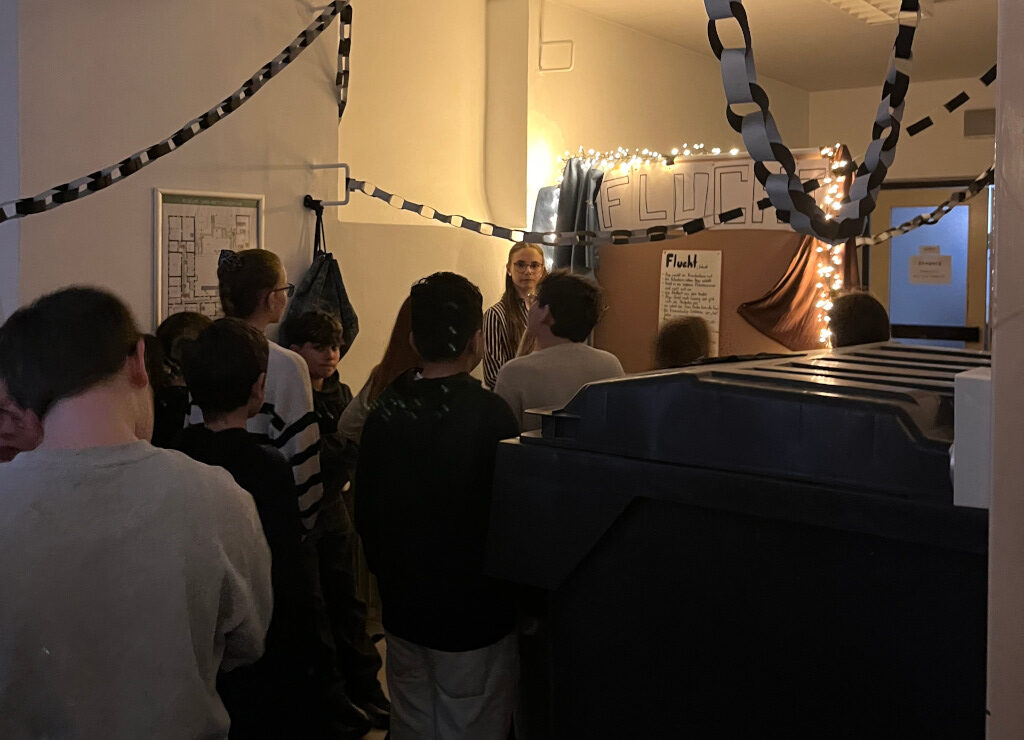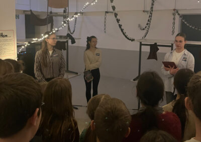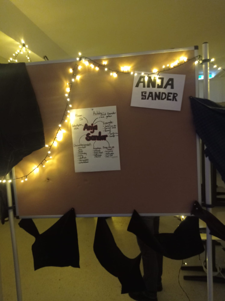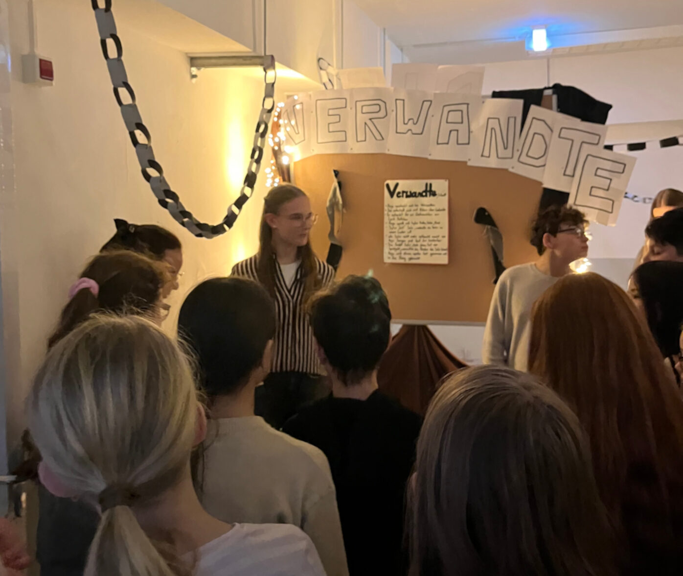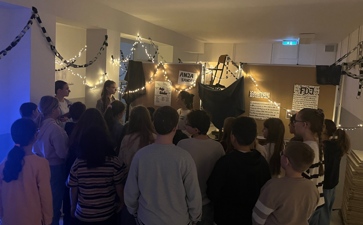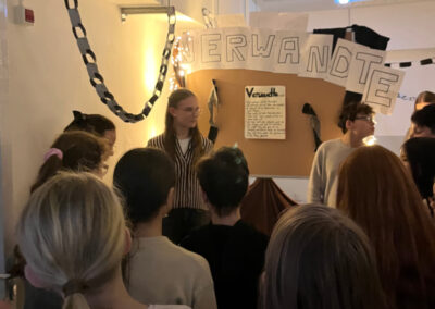 Die Neuntklässlerinnen stellten ihren Gallery Walk verschiedenen Klassen von 5-10 vor. In diesem ging es nicht nur um den Inhalt des Buches, sondern auch um den geschichtlichen Hintergrund. Außerdem benutzten sie auch Textstellen in Form von selbst aufgenommenen Audioaufnahmen, um den Inhalt noch authentischer rüberzubringen.