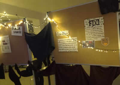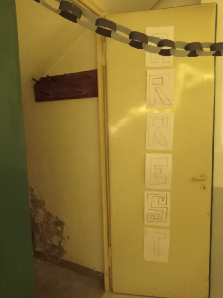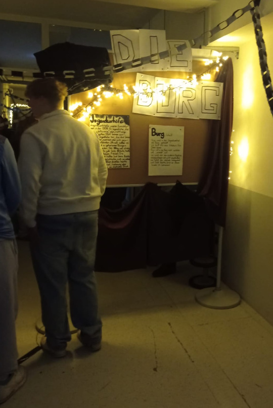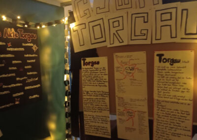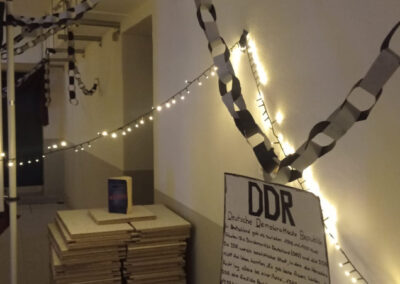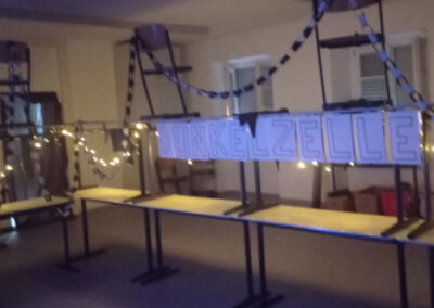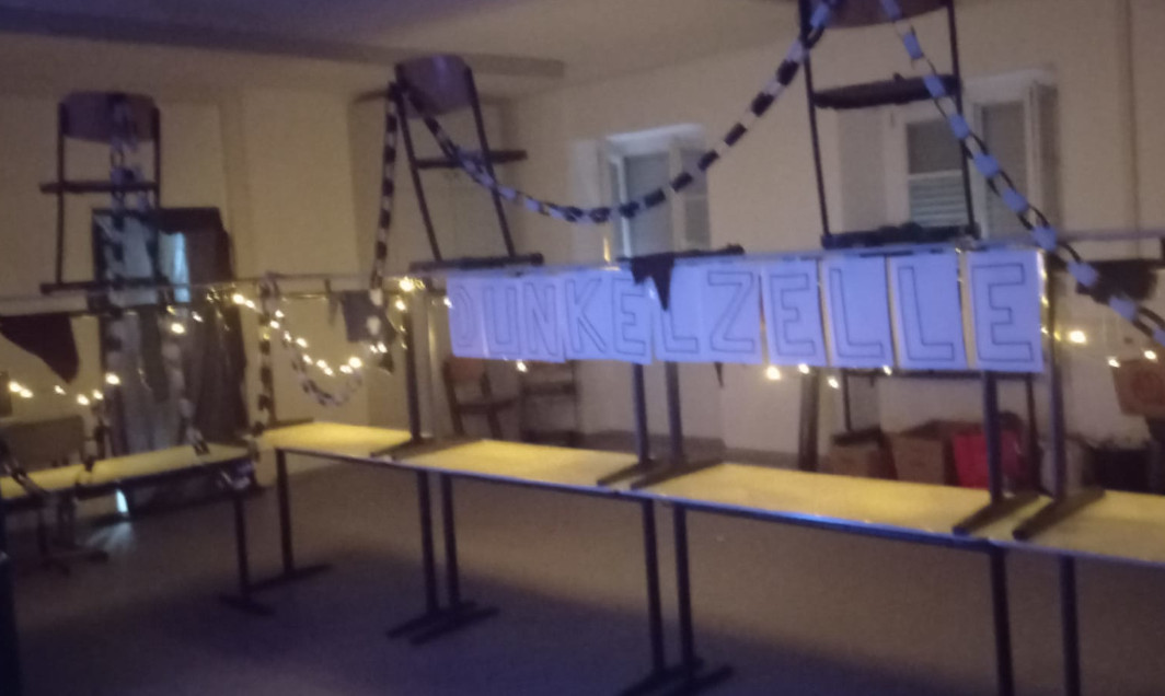 Die Schülerinnen begannen bereits vor den Weihnachtsferien mit den Vorbereitungen. Diese waren sehr zeitaufwendig, weshalb sie erst kurz vor der Projektdurchführung vollendet wurden. der Gallery Walk wurde im Keller der Schule aufgebaut, welcher eine perfekte Atmosphäre für die Präsentation bot. Die Information waren an verschiedenen Stellen im Keller verteilt und mit Girlanden, Stoffen und Lichterketten ausgeschmückt. Es gab auch ein paar Highlights, wie z.B. die Arrest- und Dunkelzelle. In dem Gallery Walk war jedes Detail geplant und hatte eine Bedeutung.